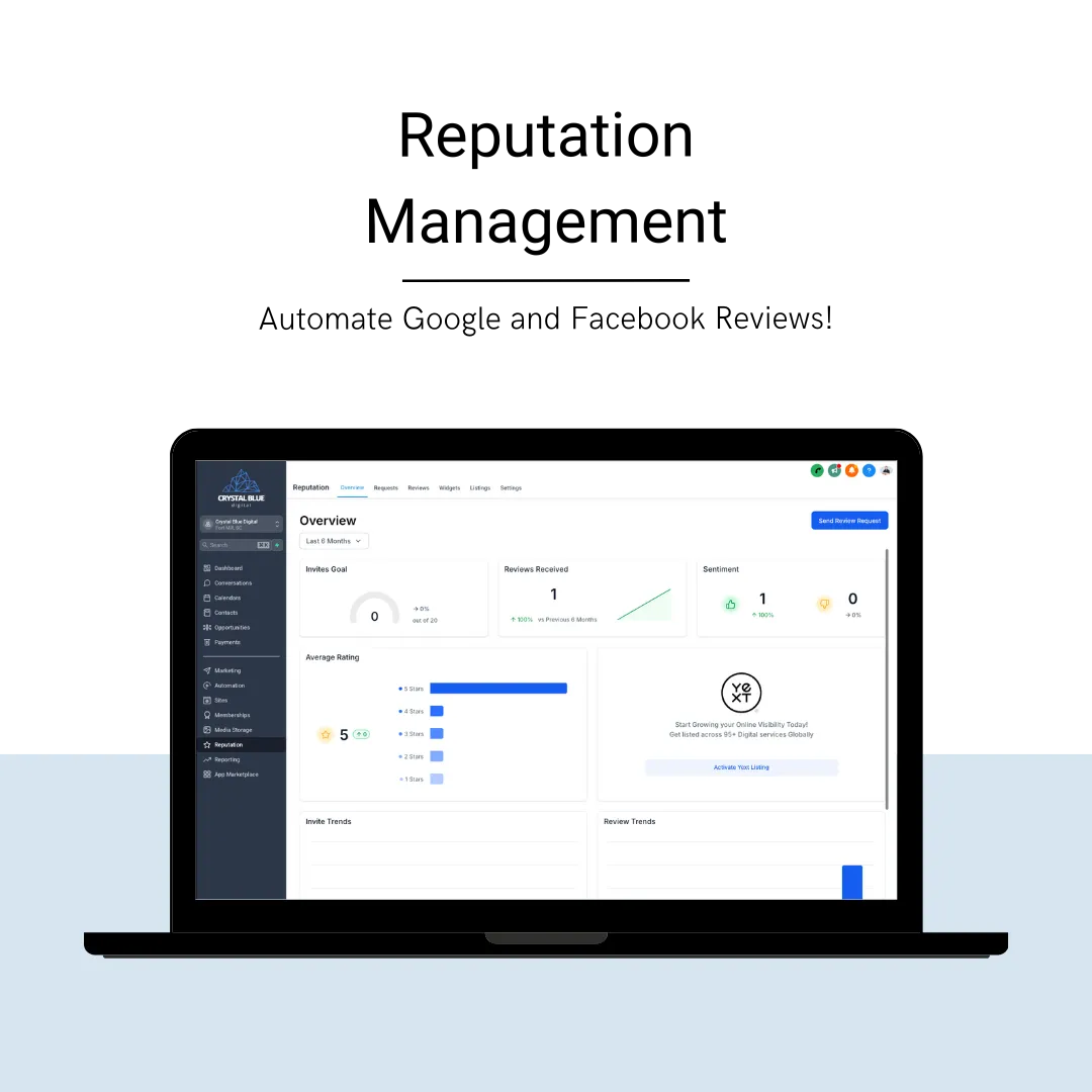 Crystal Blue Digital is a full digital marketing platform for small businesses. We start by building new or optimizing your existing website. Then our software helps you curate content for social media, email campaigns, and text campaigns to help acquire new leads!